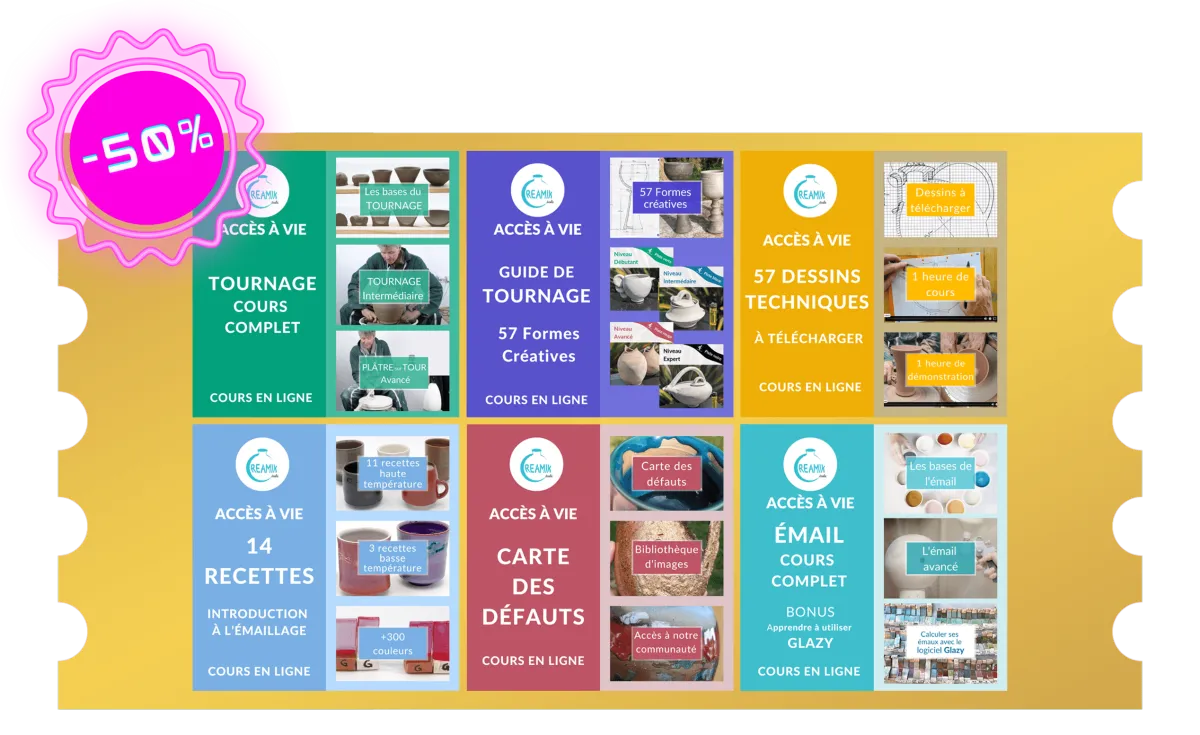 Certaines solutions que nous proposons nécessitent d’améliorer une recette d’émail, ou d’améliorer vos compétences en tournage. Si vous ne savez pas comment vous y prendre et souhaitez apprendre, nous avons tous les cours nécessaires pour vous accompagner.